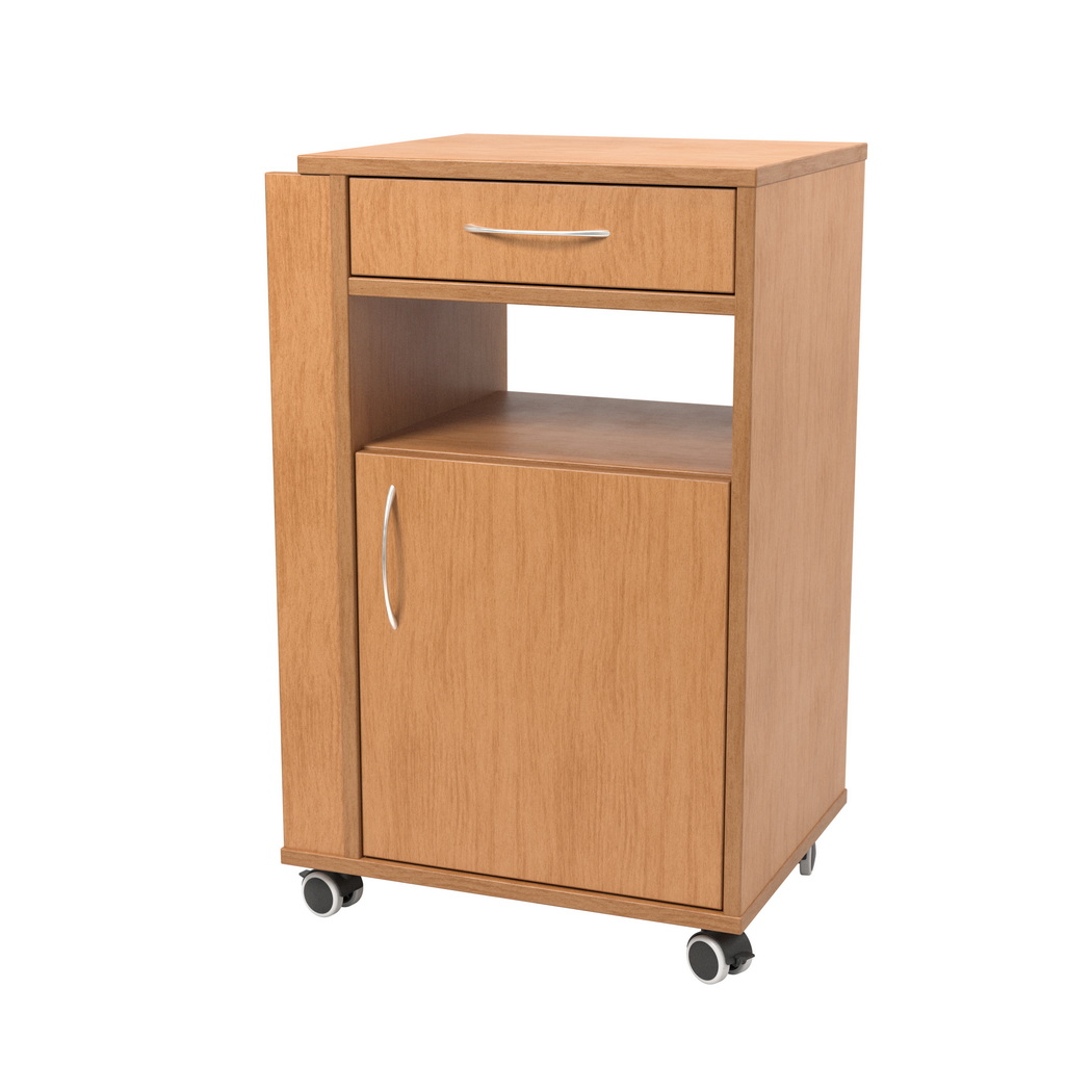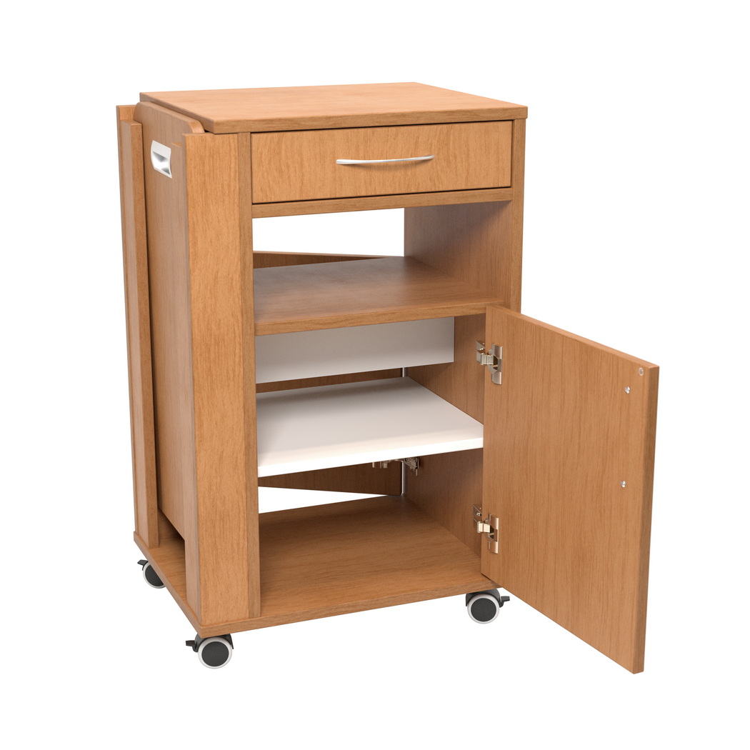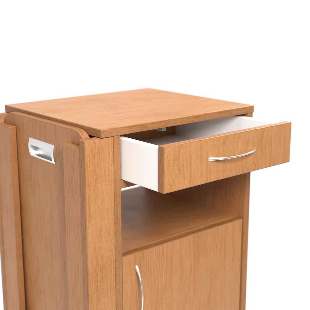 Un alt element foarte util este măsuța laterală inclusă. Aceasta extinde funcționalitatea noptierei și oferă o suprafață suplimentară care poate fi utilizată pentru servirea mesei, pentru citit, scris, utilizarea unor dispozitive sau pentru așezarea temporară a diverselor obiecte personale. În spațiile de îngrijire, o măsuță laterală integrată este un avantaj clar, deoarece adaugă confort pacientului și reduce nevoia unor piese de mobilier suplimentare. Astfel, noptiera Kabis devine nu doar un corp de depozitare, ci și un element practic de sprijin pentru activitățile zilnice desfășurate în proximitatea patului.