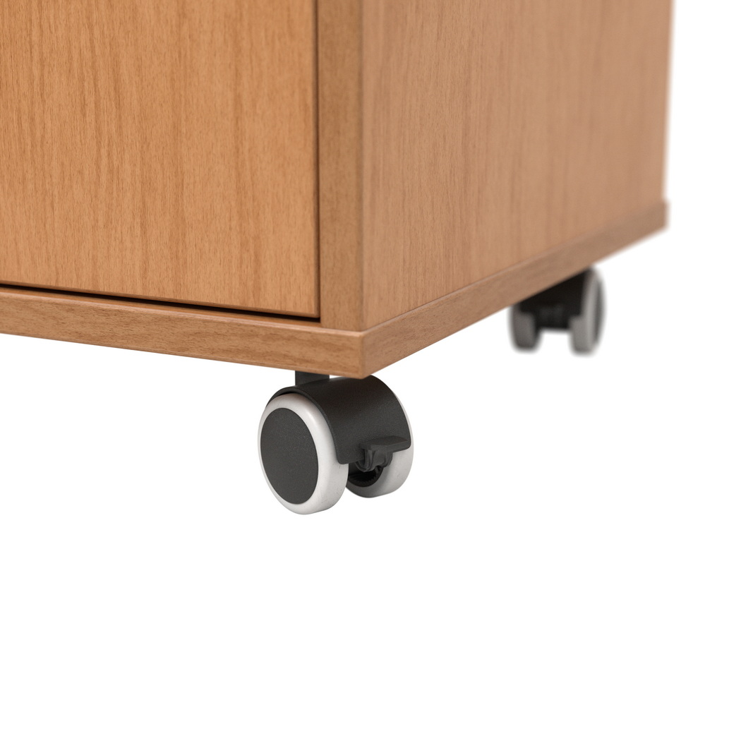 Mobilitatea este asigurată de patru roți din cauciuc cu diametrul de 50 mm, care permit deplasarea ușoară a noptierei în funcție de nevoile utilizatorului sau de organizarea încăperii. Roțile sunt proiectate să nu păteze podeaua, ceea ce reprezintă un avantaj important pentru menținerea curățeniei și a aspectului suprafețelor din saloane, clinici sau spații rezidențiale. Posibilitatea de a muta ușor noptiera contribuie la flexibilitatea în utilizare și la adaptarea rapidă a spațiului din jurul pacientului.